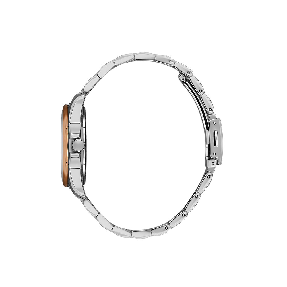 Carcasa rotunda din alama argintie cu diametrul de 34 mm se imbina perfect cu bratara bicolora din otel inoxidabil, in nuante de argintiu si auriu. Sistemul de inchidere tip fluture asigura confort si siguranta la purtare.