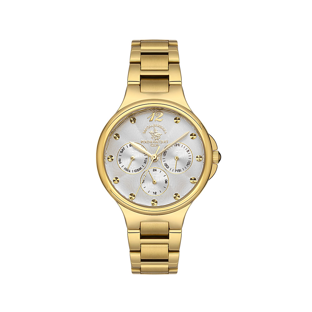 Ceasul dispune de un cadran alb-argintiu cu finisaj texturat si detalii aurii, oferind un aspect luxos si distinctiv. Indicatorii si marcajele sunt accentuate prin insertii aurii, iar subcadranele multifunctionale adauga un plus de utilitate si stil.