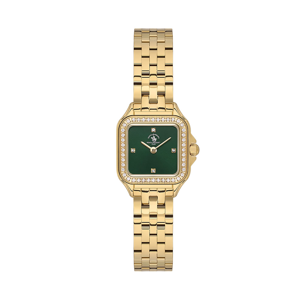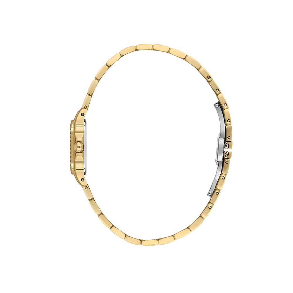 Carcasa patrata, cu dimensiuni de 24x24 mm si grosime de 7 mm, este realizata din otel inoxidabil auriu, oferind o rezistenta sporita la apa de 5 atm. Bratara aurie, cu o lungime de 185 mm si latime de 12 mm, este prevazuta cu un sistem de inchidere fluture, asigurand confort si siguranta la purtare.