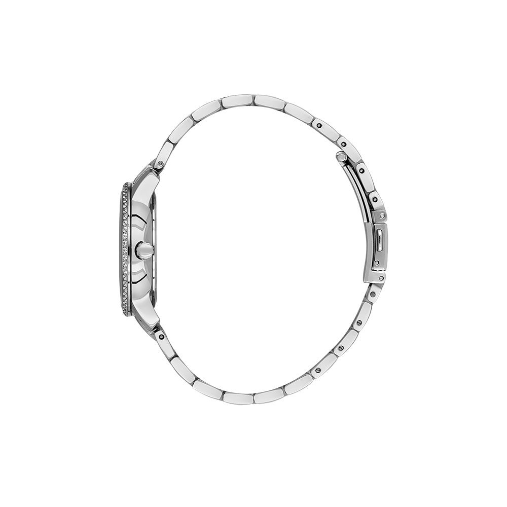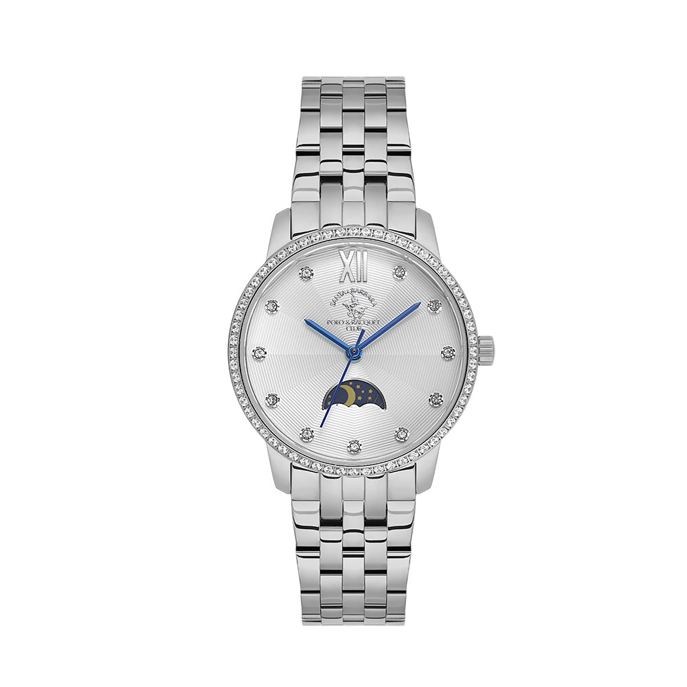 Carcasa rotunda din otel inoxidabil de culoare argintie, cu diametrul de 32 mm si grosimea de 9 mm, este completata de un cadran alb argintiu decorat cu marcaje tip cristale si indicatori fini de culoare albastru metalizat. Un element distinctiv este subcadranul decorativ in forma de semiluna, ce adauga o nota de unicitate designului general.