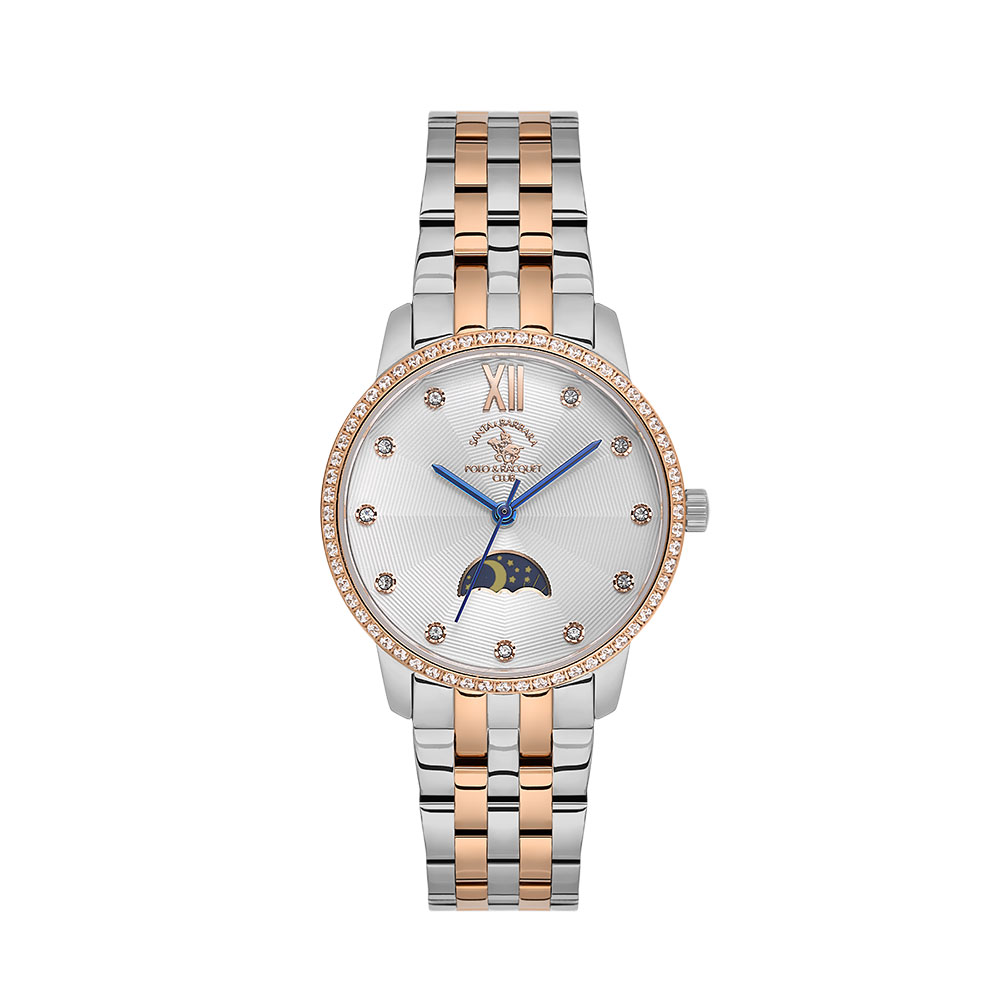 Ceasul de dama Santa Barbara Polo Unique SB.1.10638.5 imbina perfect eleganta clasica cu accente moderne, fiind alegerea ideala pentru femeile care apreciaza rafinamentul in fiecare detaliu. Cu un design bicolor sofisticat, in nuante de auriu rose si argintiu, acest model se remarca printr-un cadran alb argintiu decorat cu marcaje tip cristale si un afisaj analogic cu functie de fazele lunii.