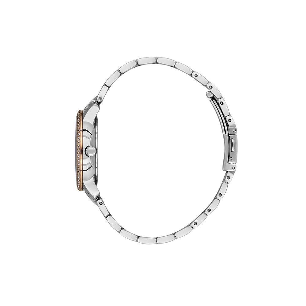Carcasa rotunda din otel inoxidabil, cu diametrul de 32 mm si grosimea de 9 mm, este completata de o bratara robusta si confortabila din acelasi material, avand o latime de 15 mm si sistem de inchidere tip fluture pentru siguranta si usurinta in utilizare. Geamul este realizat din cristal mineral, oferind o buna rezistenta la zgarieturi si pastrand aspectul impecabil al ceasului in timp.
