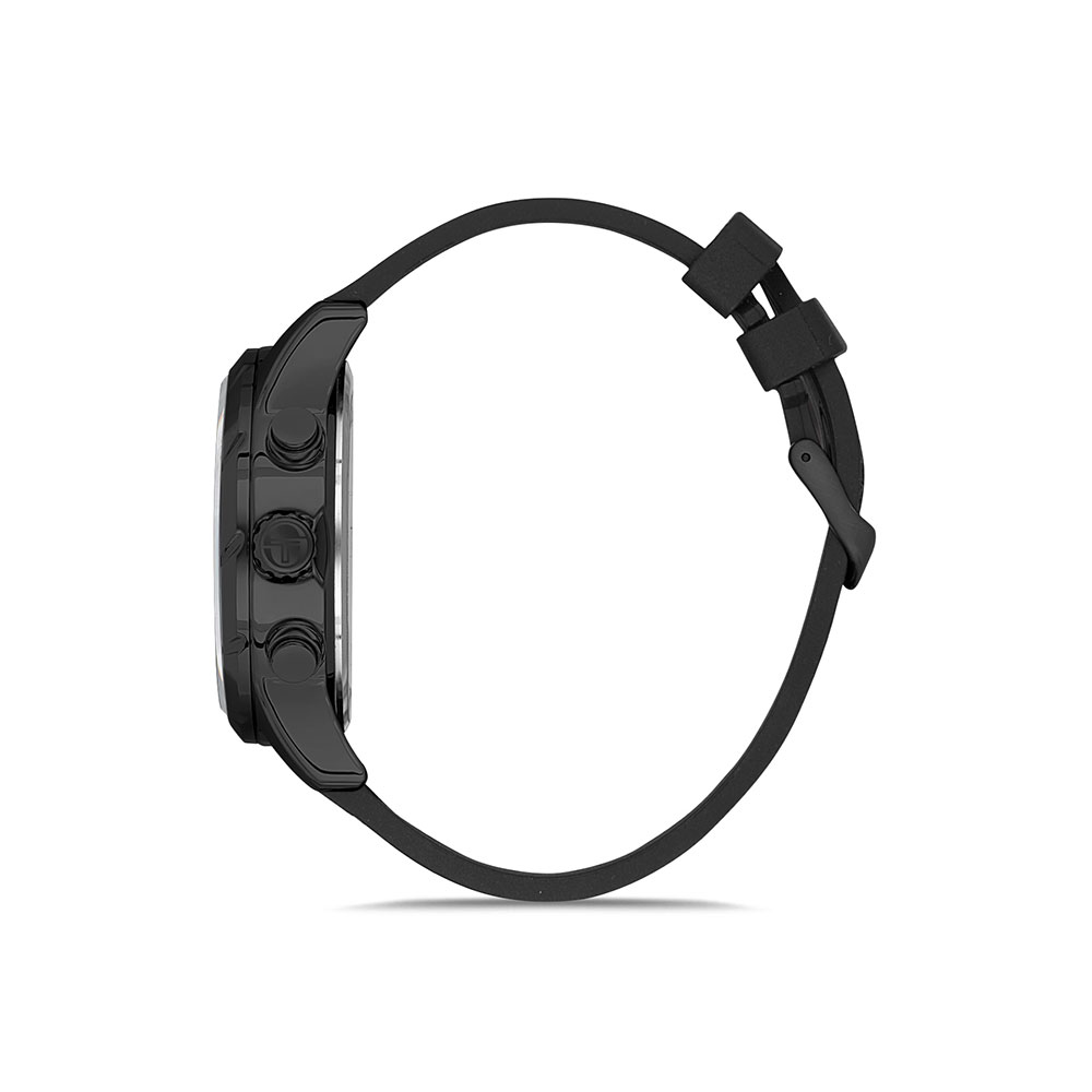 Carcasa rotunda din otel inoxidabil negru cu diametrul de 45 mm confera rezistenta si un aspect impunator, in timp ce geamul din cristal mineral asigura durabilitate si protectie impotriva zgarieturilor. Cadranul negru cu textura in relief si accente in nuante de auriu rose este completat de afisaj analog-digital, oferind vizibilitate optima in orice conditii.