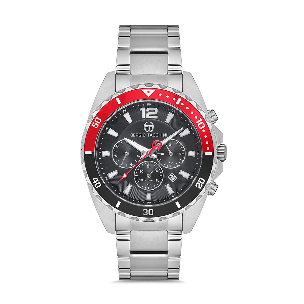 Cu un design impunator, acest ceas dispune de o carcasa rotunda din otel inoxidabil in nuanta argintie, avand un bezel bicolor in tonuri de argintiu si rosu, ce adauga un plus de dinamism esteticii sale. Cadranul negru, cu afisaj analogic si indicatoare luminoase, ofera o lizibilitate excelenta in orice conditii.