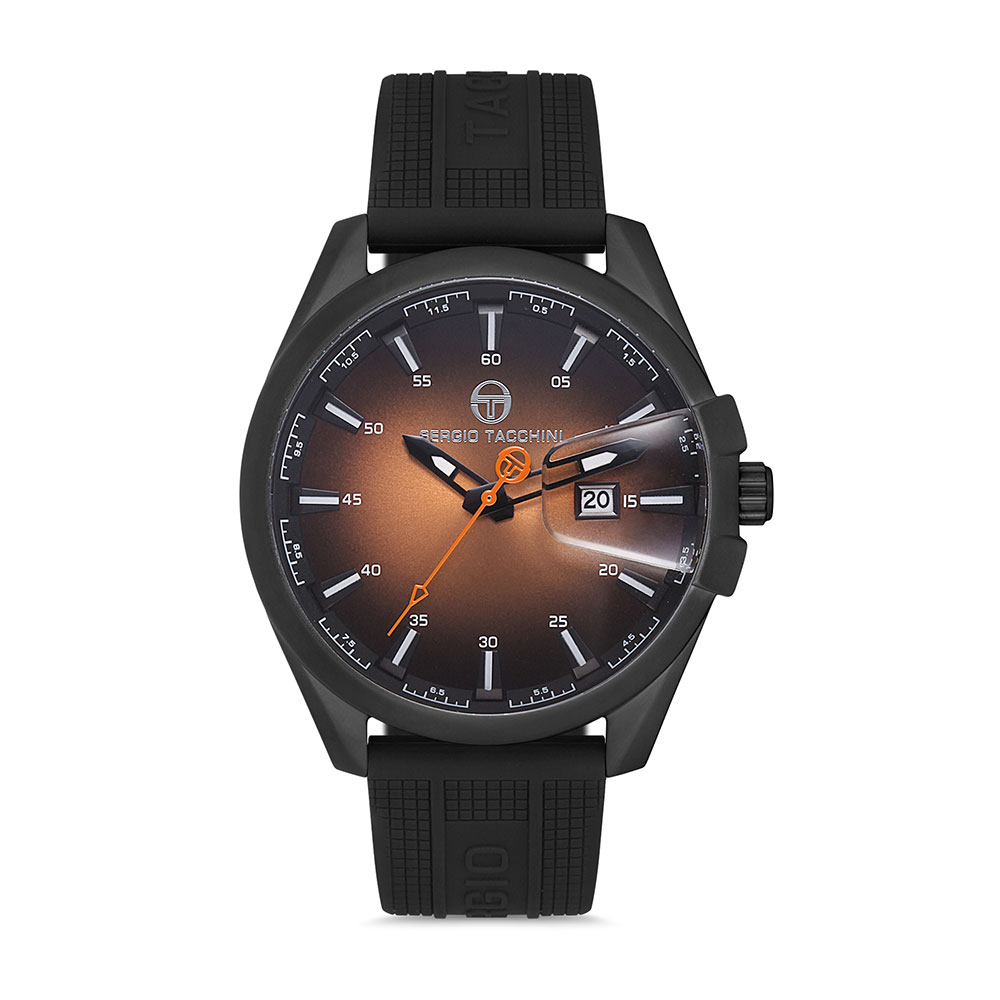 Designul sau impunator este evidentiat de carcasa rotunda din alama, cu un diametru de 46 mm si finisaj negru mat, conferindu-i un aer sofisticat si masculin. Cadranul in nuante de negru si maro degrade adauga un efect vizual captivant, completat de logo-ul Sergio Tacchini pozitionat elegant.