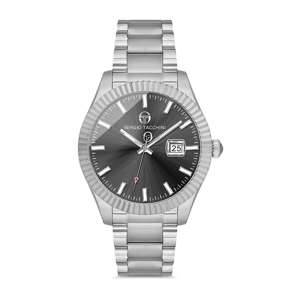 Carcasa rotunda, cu un diametru de 45 mm, este realizata din otel inoxidabil argintiu, oferind rezistenta si un aspect sofisticat. Bratara robusta, formata din zale alternante mate si lucioase, completeaza perfect acest design elegant, avand un sistem de inchidere fluture pentru confort si siguranta.