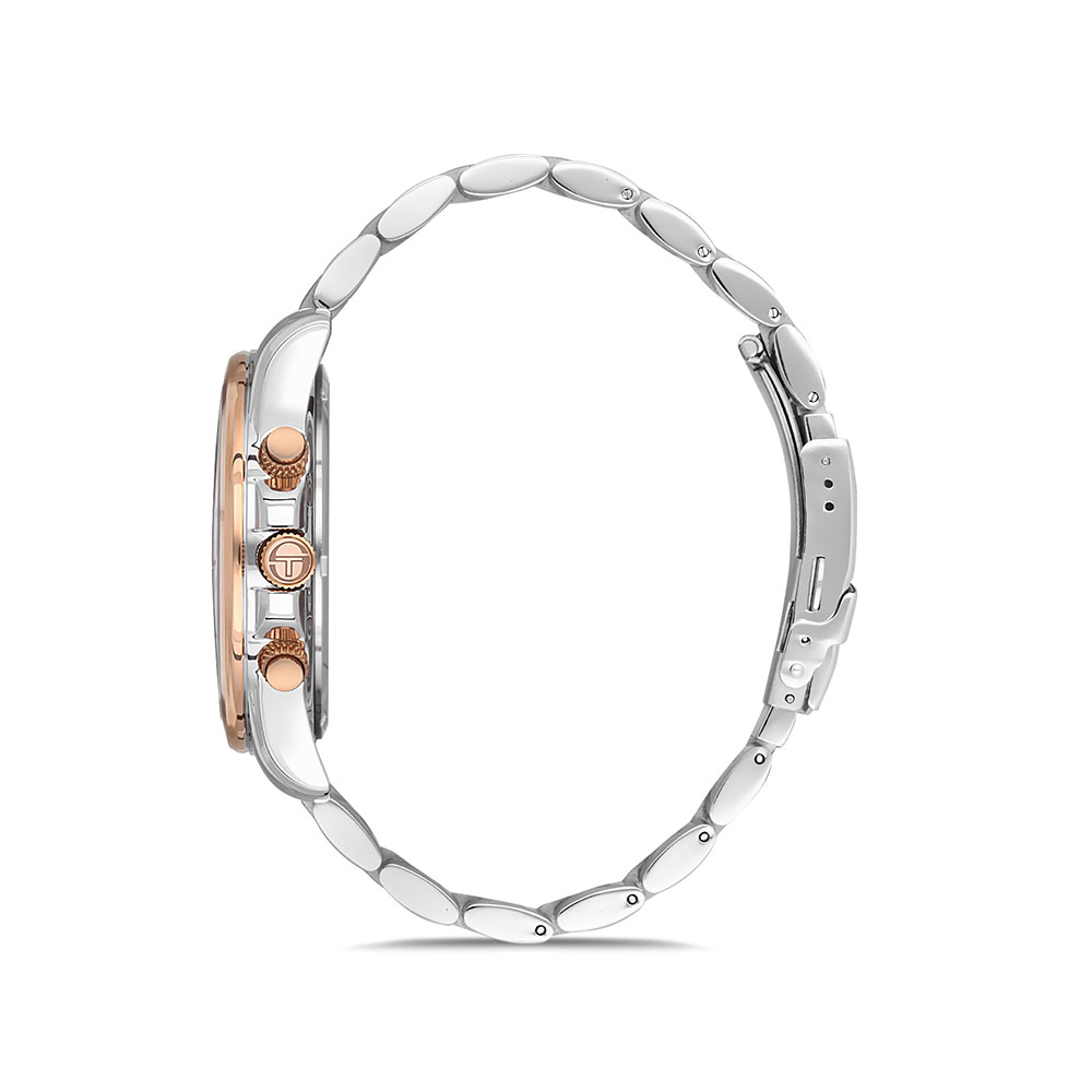 Bratara din otel inoxidabil, cu un design bicolor in argintiu si auriu rose, asigura un confort excelent si o rezistenta indelungata. Sistemul de inchidere fluture garanteaza o fixare sigura si eleganta pe incheietura.
