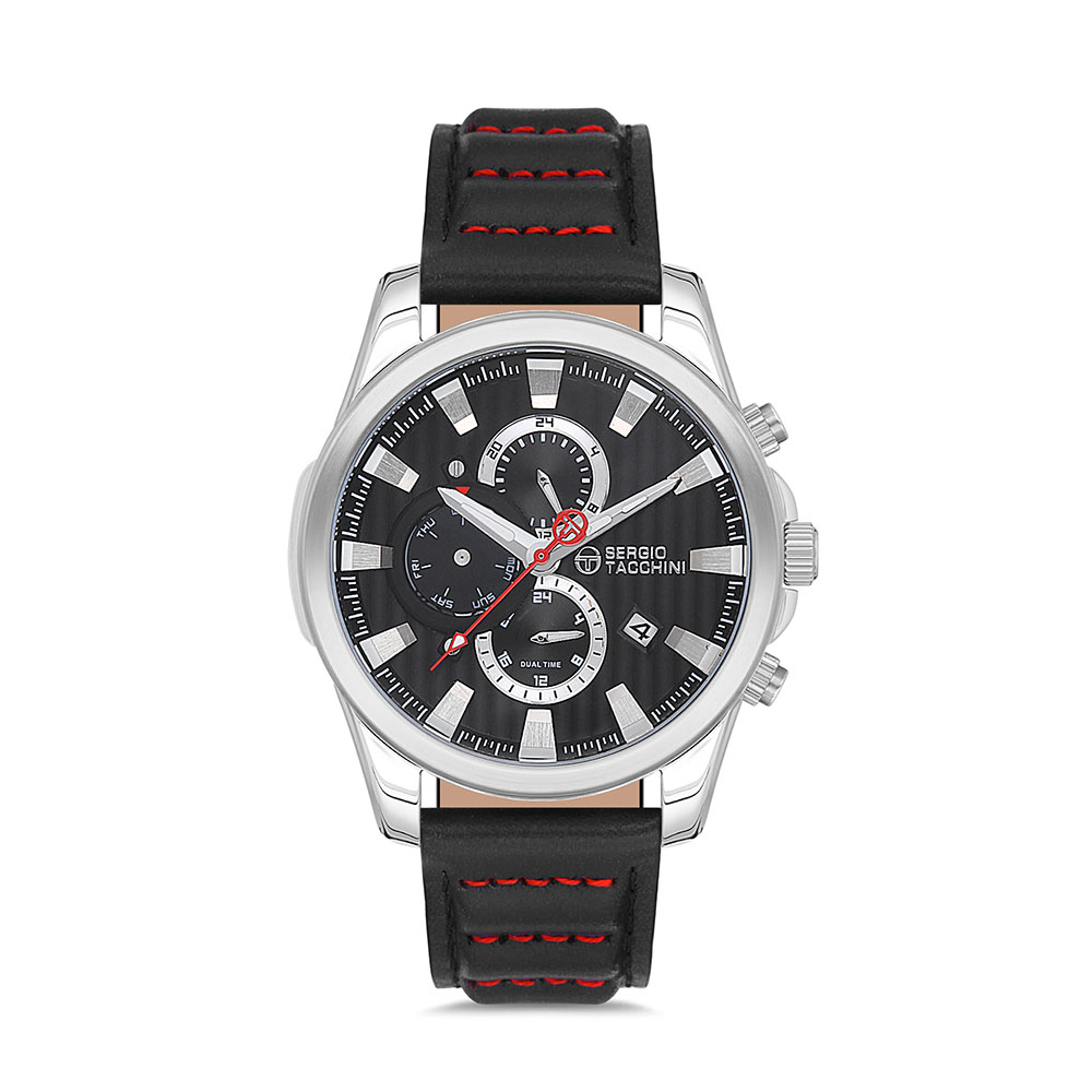 Carcasa rotunda din alama argintie confera durabilitate si un aspect sofisticat, iar geamul din cristal mineral protejeaza impotriva zgarieturilor. Cureaua din piele neagra, cu detalii rosii cusute, ofera un contrast elegant si confort sporit pe incheietura, fiind echipata cu sistem de inchidere tip catarama.