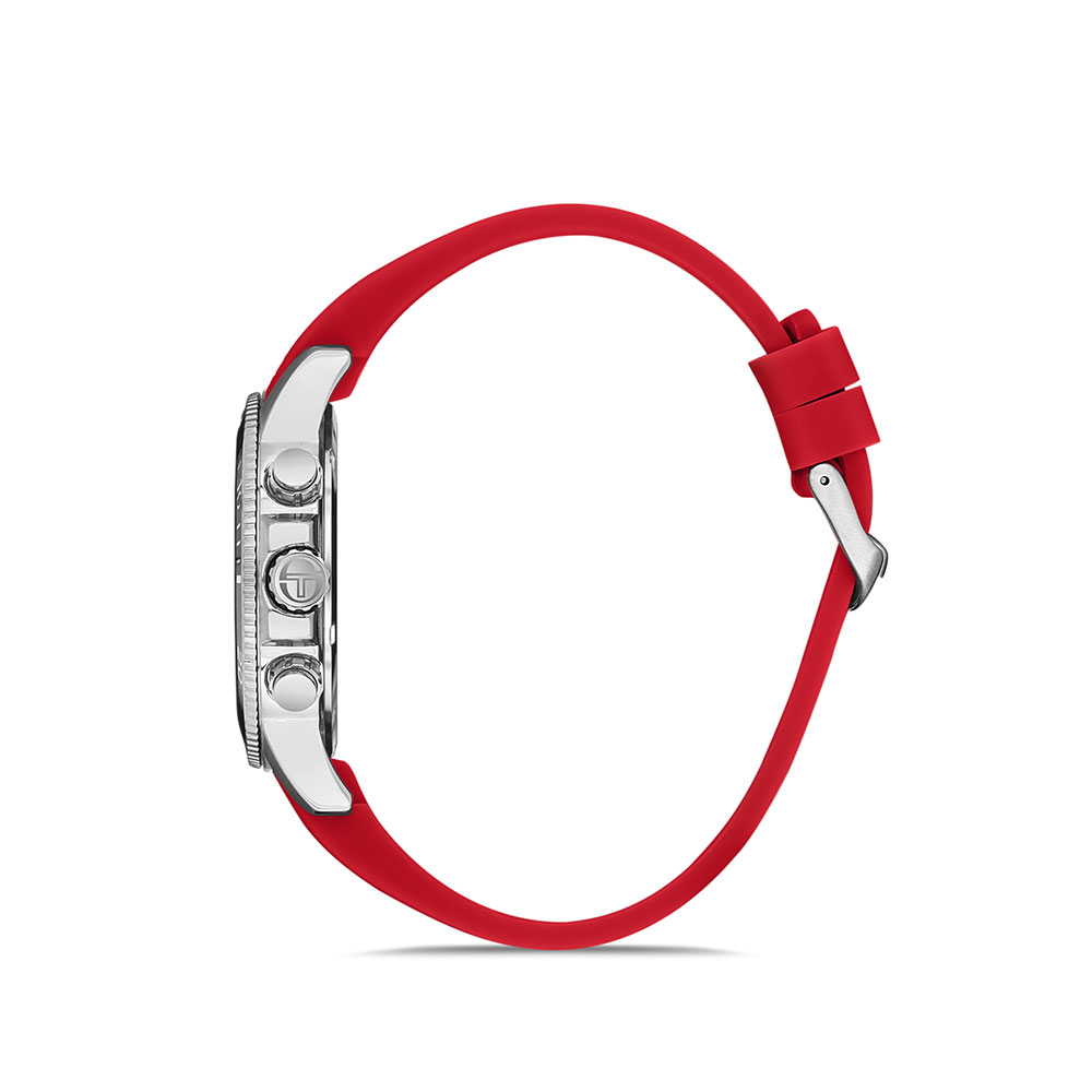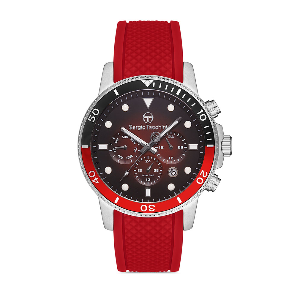Carcasa rotunda, realizata din otel inoxidabil argintiu, ofera durabilitate si rezistenta in timp. Bezelul decorativ in combinatie de rosu si negru adauga un contrast puternic si dinamic, completand perfect aspectul sportiv al ceasului.