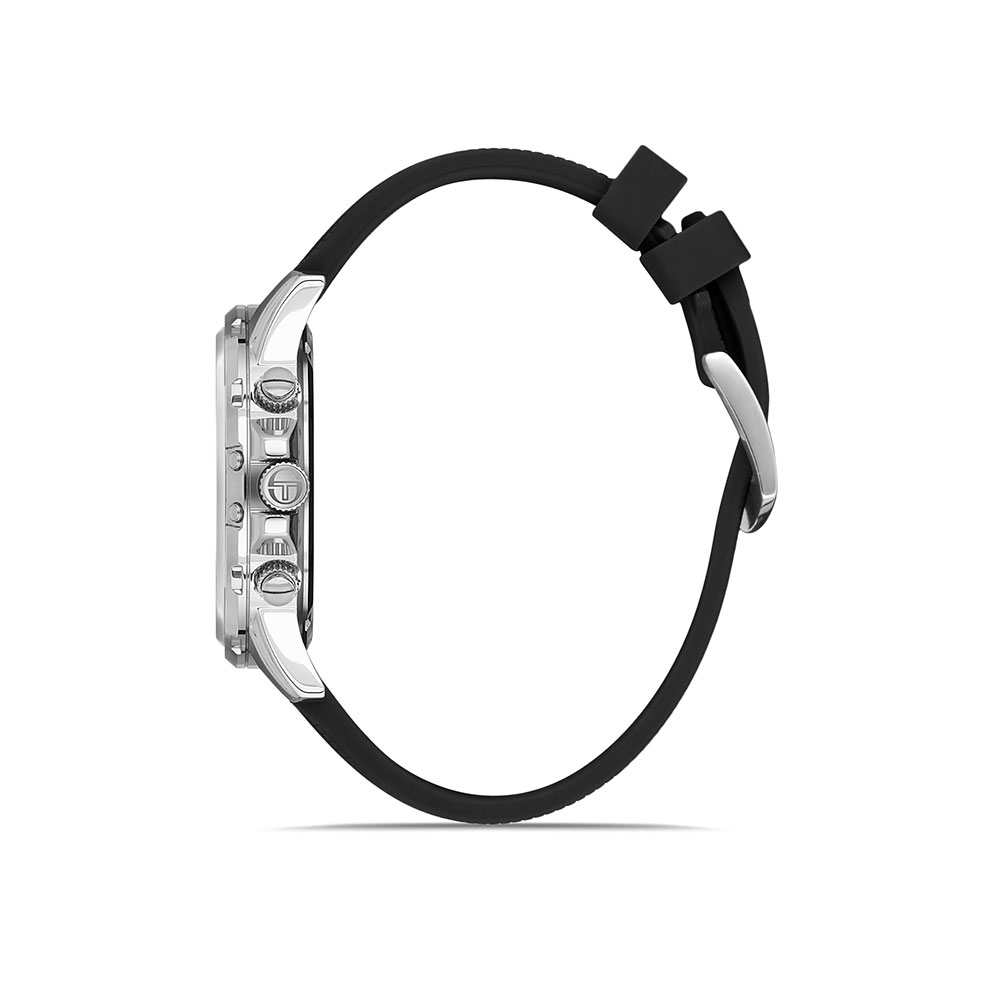 Carcasa rotunda din otel inoxidabil argintiu de 45 mm confera durabilitate si un aspect rafinat, completat de un geam din cristal mineral rezistent la zgarieturi. Cureaua din silicon negru asigura confort maxim si un aspect sportiv, fiind echipata cu un sistem de inchidere cu catarama pentru siguranta sporita.