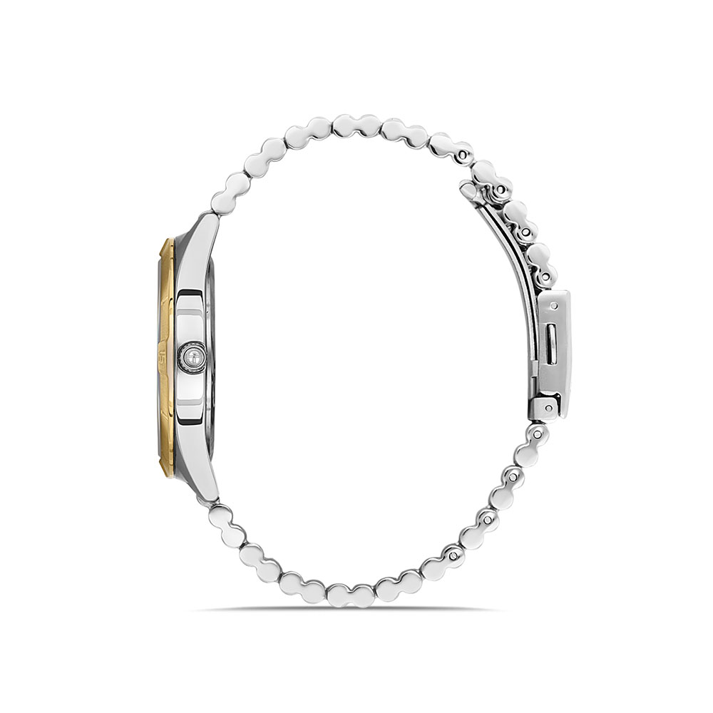 Indicatoare luminoase; carcasa argintie, cu bezel decorativ auriu; bratara tip zale, in doua culori, argintiu si auriu, cu inchizatoare tip fluture; afiseaza data si ziua curente si ora in format 12/24; functie dual time, afiseaza doua fuse orare diferite.