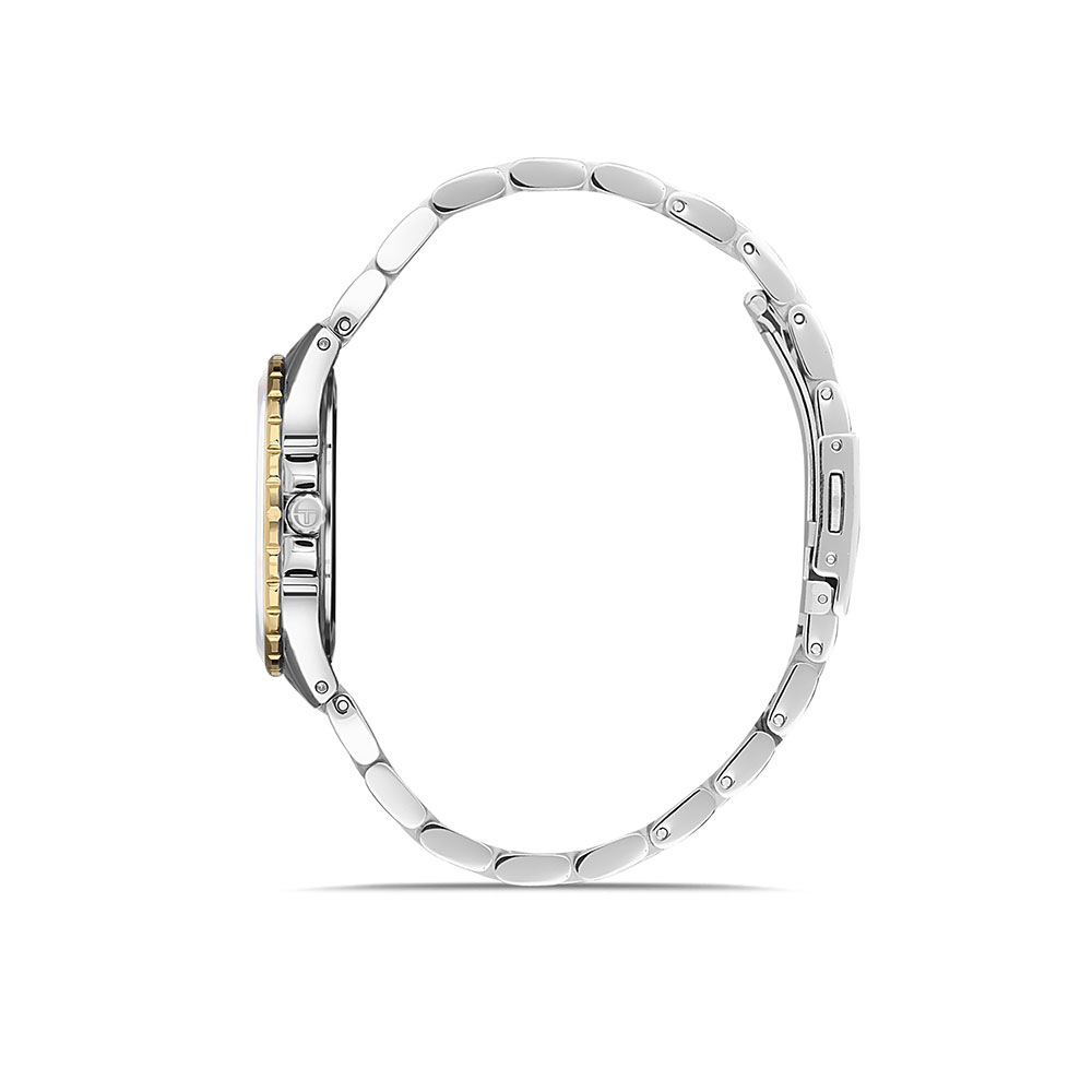 Cu o carcasa rotunda de 34 mm din otel inoxidabil si un cadran argintiu decorat cu detalii aurii, acest model se remarca printr-un design echilibrat si elegant. Bratara bicolora, in nuante de auriu si argintiu, completeaza armonios estetica sofisticata, oferind versatilitate in purtare.