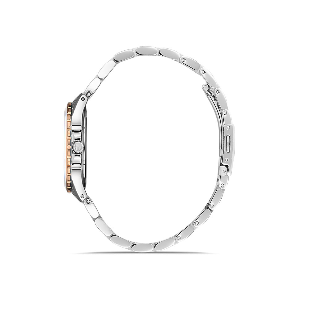 Ceasul impresioneaza printr-un cadran argintiu cu finisaj satinat, decorat cu marcaje orare si indicatoare in nuante de auriu rose, oferind un contrast subtil si elegant. Carcasa rotunda de 34 mm, realizata din otel inoxidabil, asigura durabilitate si confort in purtare.