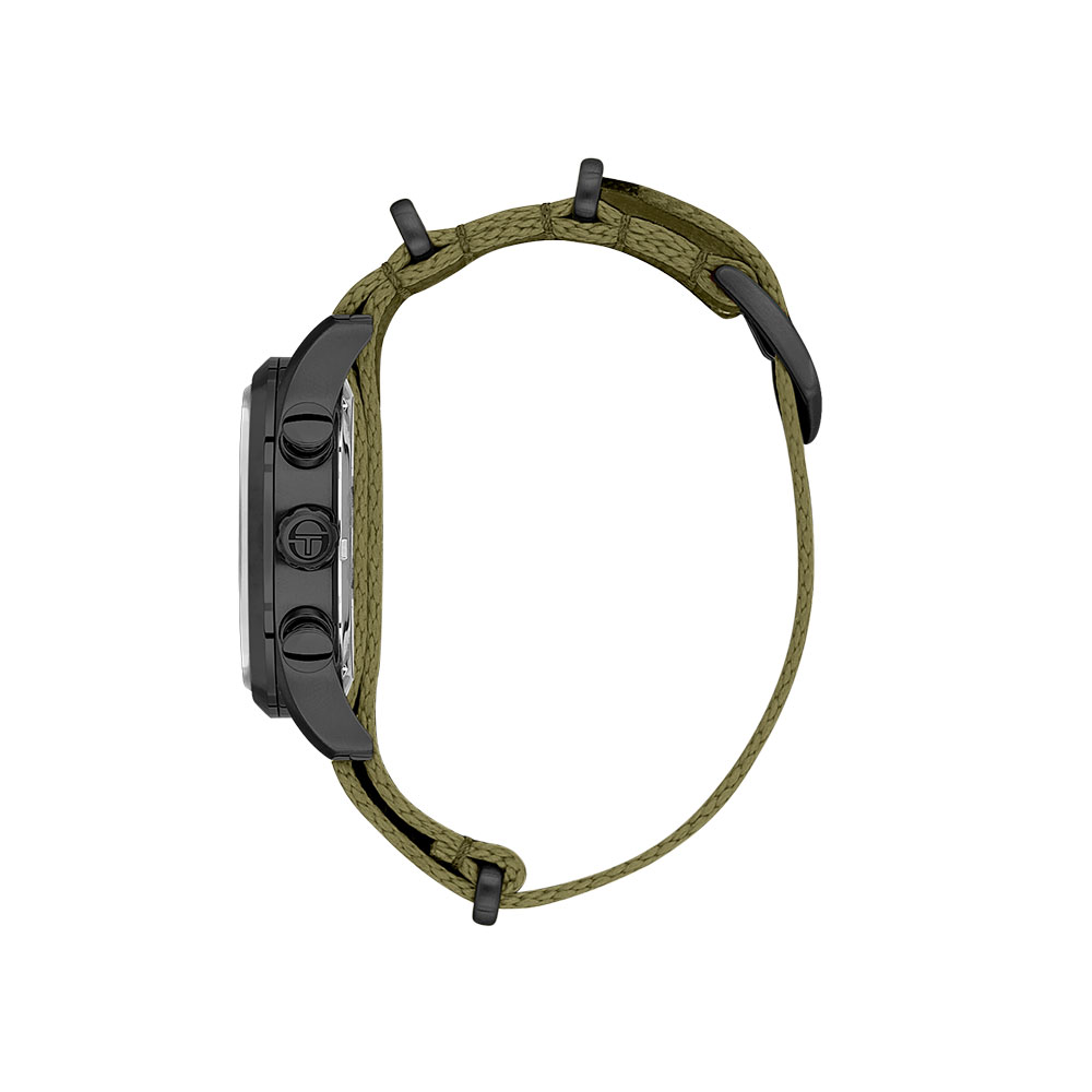 Carcasa rotunda din otel inoxidabil negru cu diametru de 42 mm si grosime de 13 mm confera rezistenta si un aspect modern. Combinatia cu o curea textila kaki de 22 mm latime asigura un confort sporit la purtare si un stil casual-sport potrivit oricarei tinute.