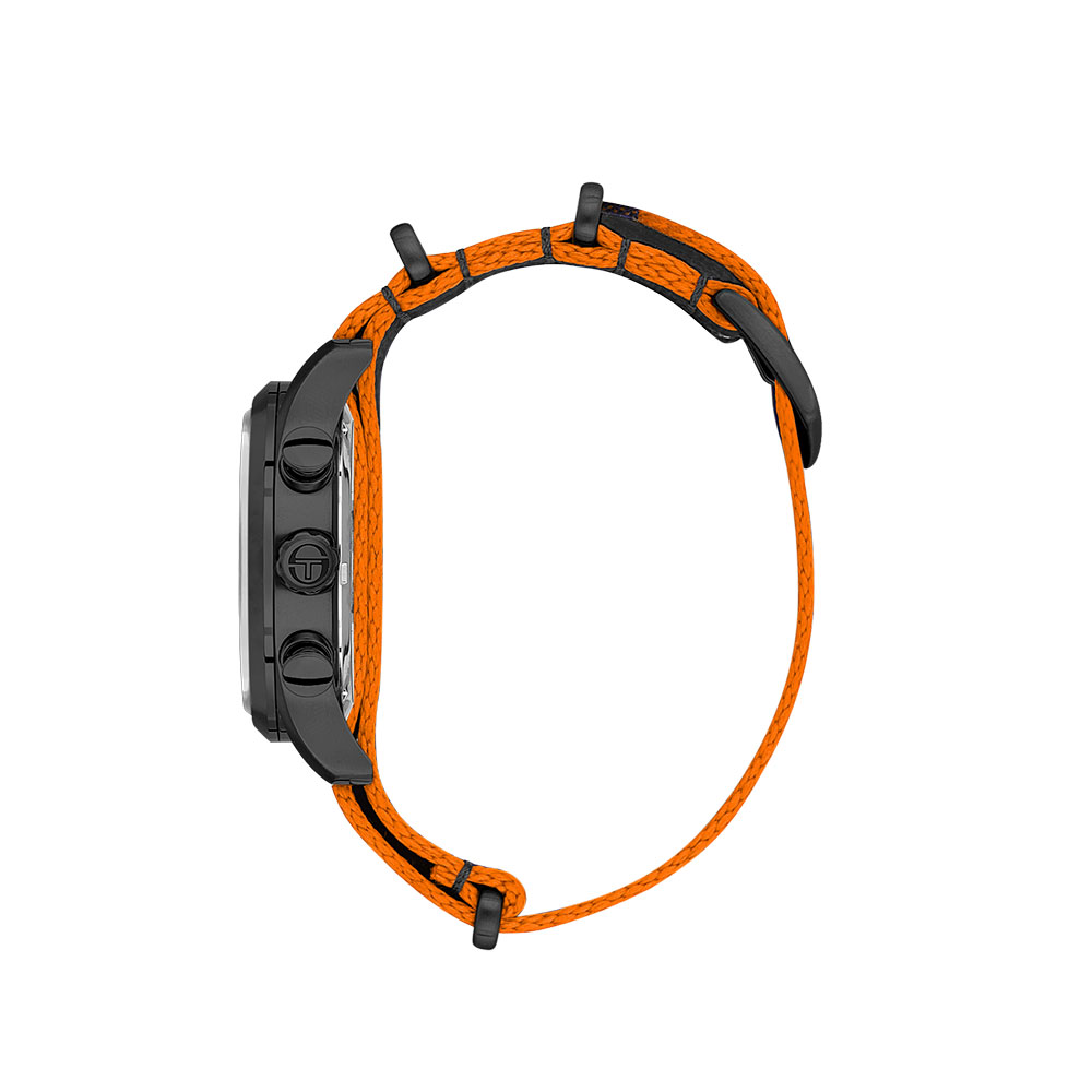 Carcasa rotunda din otel inoxidabil cu diametrul de 42 mm si grosimea de 13 mm este finisata intr-o eleganta nuanta de negru, conferindu-i un aspect robust si masculin. Cadranul negru este accentuat de detalii portocalii si gri, creand un contrast puternic care imbunatateste lizibilitatea.