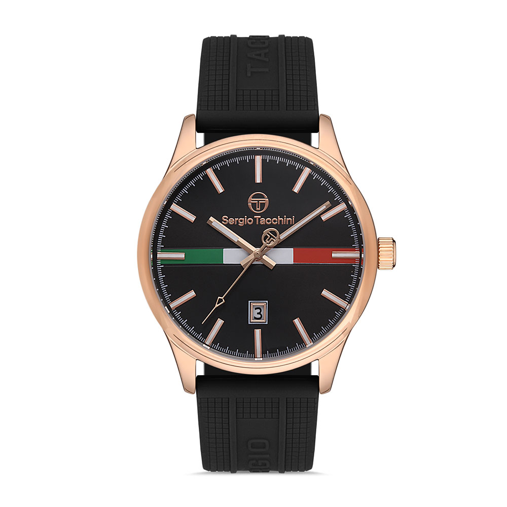 Ceasul dispune de o carcasa rotunda din otel inoxidabil auriu rose, ce ofera un aspect elegant si rezistenta sporita. Cadranul negru este decorat subtil cu accente inspirate din steagul Italiei – verde, alb si rosu, oferindu-i un aer distinctiv. Indicatorii si limbile luminoase asigura vizibilitate optima in orice conditii.