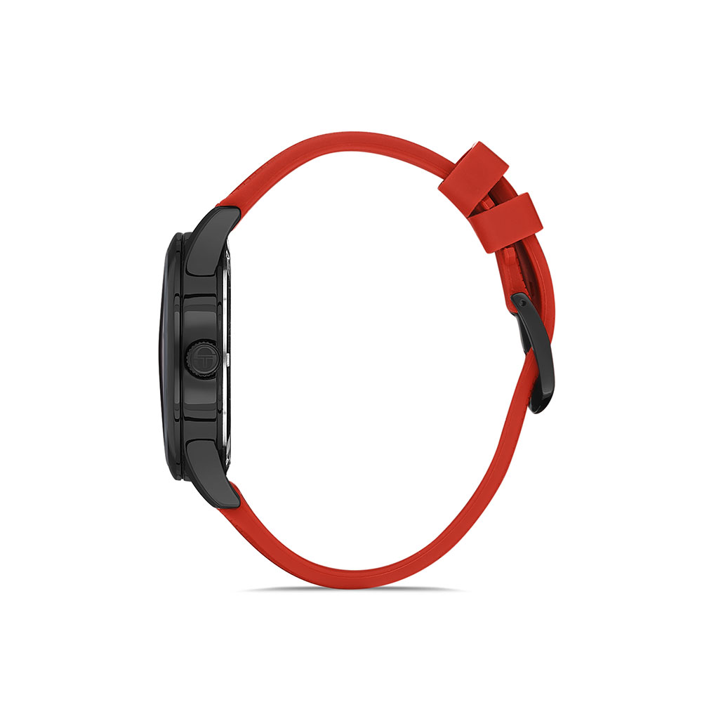 Un alt punct forte al acestui ceas este cureaua din silicon rosu, care nu doar ca ofera un confort sporit la purtare, dar si completeaza perfect designul dinamic al ceasului. Sistemul de inchidere cu catarama permite ajustarea facila pe incheietura, asigurand o fixare sigura.