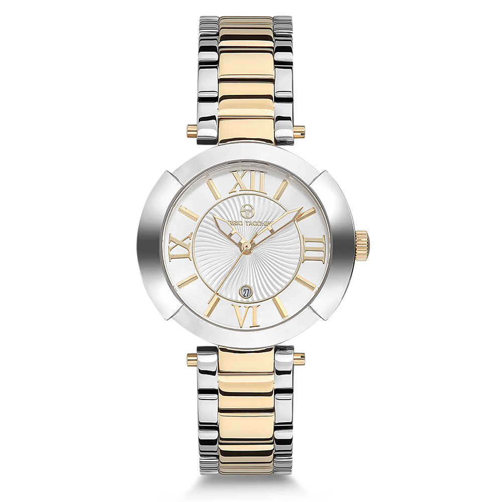 Din colectia Essentials, un ceas de dama Sergio Tacchini ST.4.103.02, cu carcasa din otel inoxidabil, in culoare argintie. Cadranul argintiu, cu detalii aurii si indicatoare luminoase, este protejat de un geam din cristal mineral cu strat antireflex. Bratara din otel inoxidabil, in doua tonuri, argintiu si auriu, se inchide intr-un sistem tip fluture. Rezistenta la apa este de 5 atm. Afiseaza data curenta. Logo pe carcasa, cadran, capac si inchizatoare. Ceasul este original, nou, livrat in cutie proprie, impreuna cu factura, manual de utilizare si garantie 2 ani.