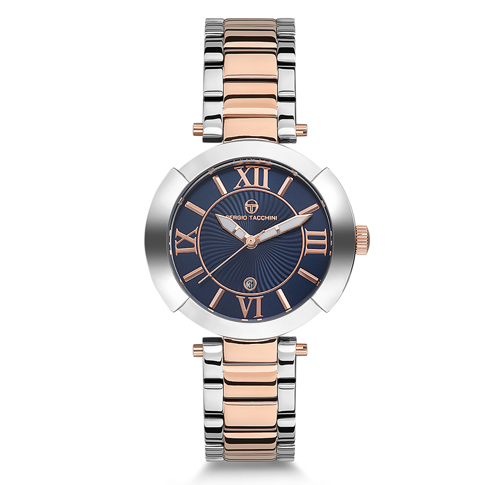 Ceas de dama Sergio Tacchini ST.4.103.03 din colectia Essentials. Are carcasa rotunda, argintie, din otel inoxidabil, cadranul albastru cu detalii aurii rose si indicatoare luminoase, geam din cristal mineral cu strat antireflex, bratara din otel inoxidabil, in doua tonuri, argintiu si auriu rose, inchizatoare tip fluture cu doua butoane laterale. Rezistenta la apa este de 5 atm. Afiseaza data curenta. Logo pe carcasa, cadran, capac si inchizatoare. Ceasul este original, nou, livrat in cutie proprie, impreuna cu factura, manual de utilizare si garantie 2 ani.