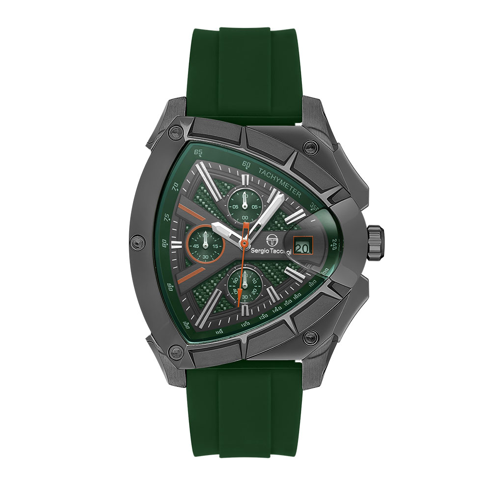 Carcasa ovala din otel inoxidabil de culoare antracit si cadranul analogic verde, protejat de geam din cristal mineral, confera eleganta si rezistenta. Curea din silicon verde, confortabila si durabila, se potriveste perfect stilului activ, fiind prevazuta cu inchidere tip catarama pentru siguranta maxima.