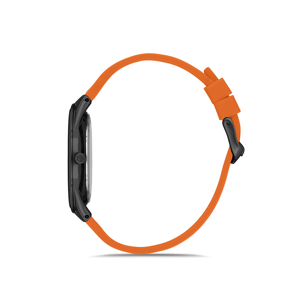 Un element distinctiv al acestui ceas este cureaua portocalie din silicon, care adauga un contrast puternic si un aer energic designului sau. Sistemul de inchidere cu catarama permite o fixare sigura si confortabila pe incheietura.