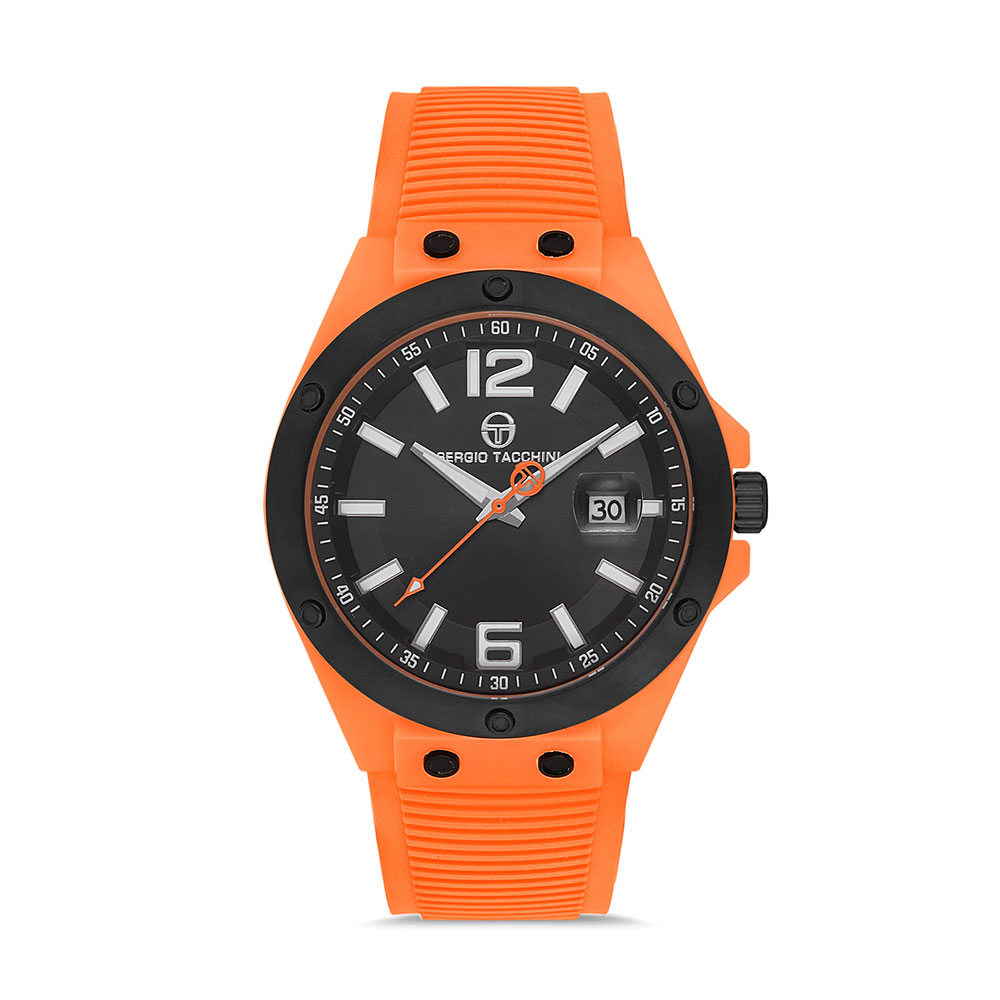Ceasul impresioneaza prin carcasa rotunda portocalie de 45 mm, completata de un bezel decorativ negru care adauga un plus de contrast si rafinament. Cadranul negru ofera o vizibilitate excelenta datorita indicatorilor luminoși si a afisajului clar al orelor. De asemenea, ceasul include un afisaj pentru data, facilitand organizarea zilnica.