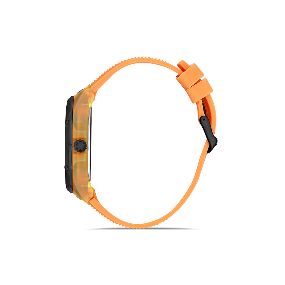 Confortul la purtare este garantat de cureaua din silicon portocaliu, care se fixeaza sigur pe incheietura datorita sistemului de inchidere cu catarama. Cu o rezistenta la apa de 5 ATM, acest ceas poate face fata cu succes contactului ocazional cu apa.