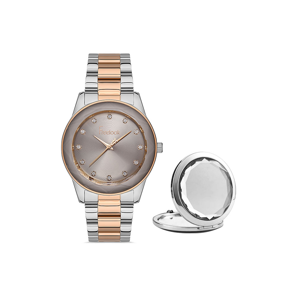 Ceasul are un mecanism Quartz de inalta precizie, cu o abatere de doar ±20 de secunde pe luna, garantand acuratetea timpului. Afisajul analogic este completat de un cadran gri, decorat cu cristale stralucitoare, care adauga un plus de rafinament. Carcasa din alama argintie si bratara din otel inoxidabil cu nuante de auriu rose subliniaza un design modern si durabil.