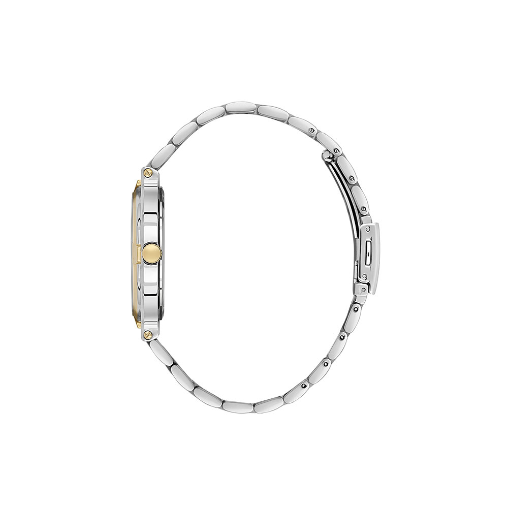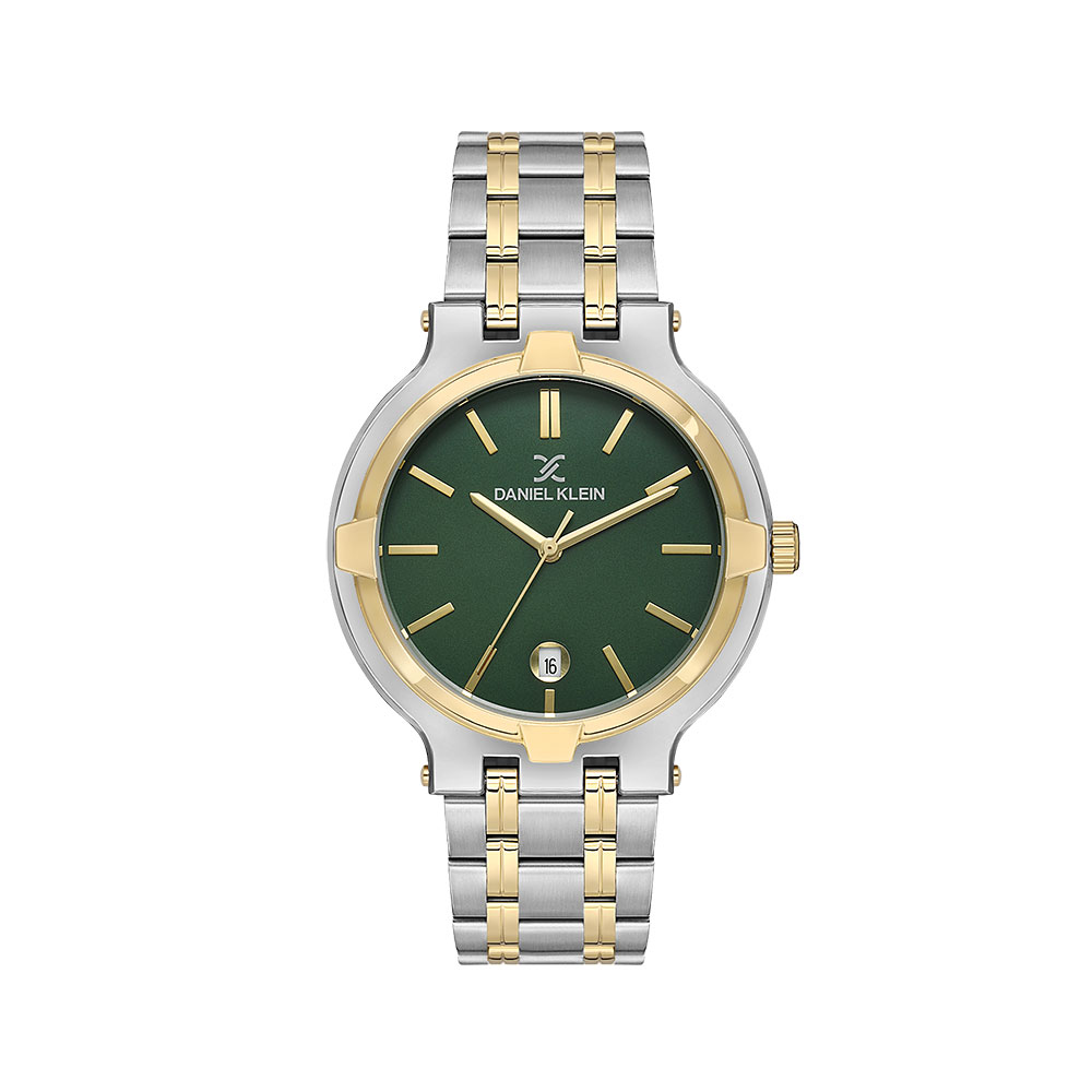 Designul este definit de o carcasa rotunda din aliaj metalic in nuanta auriu lucios, completata de o bratara bicolora din otel inoxidabil argintiu si auriu, ce ofera un contrast vizual placut si o rezistenta sporita in timp. Cadranul de culoare verde inchis adauga o nota de originalitate si eleganta discreta, fiind protejat de un geam din cristal mineral rezistent la zgarieturi.