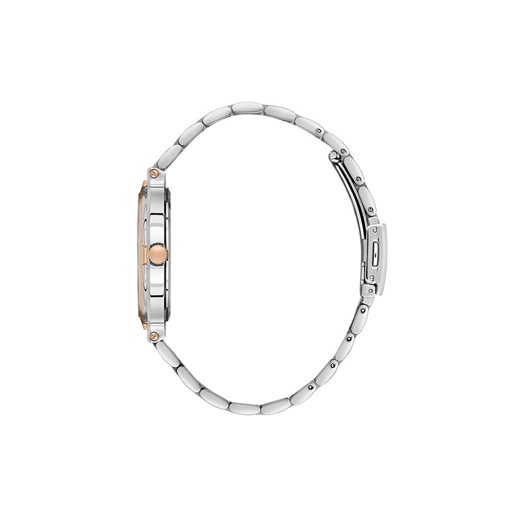 Carcasa rotunda cu diametru de 41 mm este realizata din aliaj metalic durabil si are un finisaj auriu rose, care se imbina armonios cu cadranul negru si bratara din otel inoxidabil in nuante de argintiu si auriu rose. Geamul din cristal mineral ofera rezistenta la zgarieturi, iar mecanismul Quartz japonez Epson VX42E12W asigura o precizie remarcabila, cu o abatere de doar ±20 secunde/luna.
