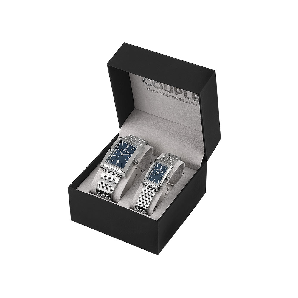 Ambele ceasuri dispun de cadran bleumarin elegant, protejat de un geam din cristal mineral rezistent la zgarieturi. Carcasa dreptunghiulara este realizata din aliaj metalic argintiu, iar bratara robusta din otel inoxidabil argintiu asigura durabilitate si confort la purtare. Sistemul de inchidere tip fluture contribuie la o fixare sigura si un aspect rafinat.