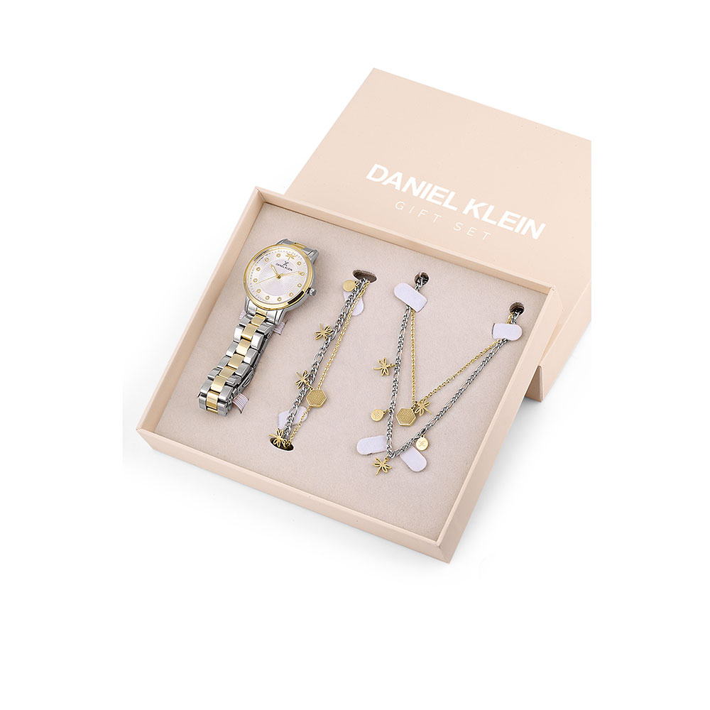 Cadran decorat cu zirconii albe; indicatoare luminoase; carcasa argintie, cu bezel decorativ auriu, bratara tip zale, in doua culori, argintiu si auriu, cu inchizatoare tip fluture; ceasul este comercializat in cutie, sub forma de set, impreuna cu o bratara si un lant din otel inoxidabil, bicolore, in lungime de 18 cm, respectiv 47 cm.