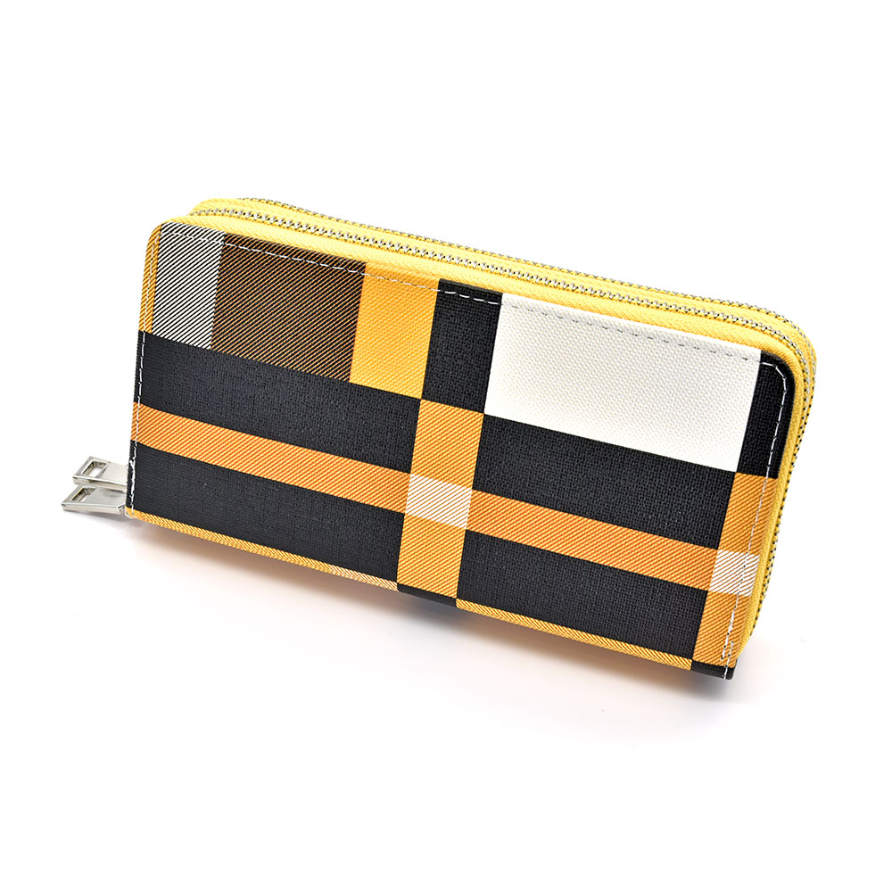 Fabricat din piele ecologica de inalta calitate, portofelul se remarca prin modelul sau cadrilat in nuante vibrante de galben si accente de negru, completate de o cusatura alba rafinata. Acest accesoriu versatil poate fi folosit atat ca portofel, cat si ca o mica poseta, datorita baretei scurte detasabile.