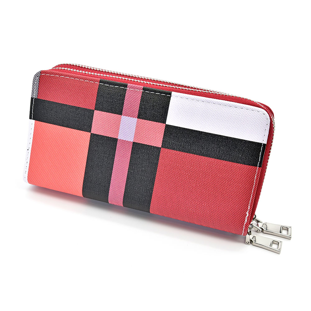 Completeaza-ti tinuta cu portofelul Daphne din piele ecologica visinie, un accesoriu elegant si practic, perfect pentru femeile care apreciaza atat designul modern, cat si functionalitatea. Cu un model cadrilat in nuante de visiniu, rosu si accente de negru, acest portofel adauga un plus de stil oricarei aparitii.