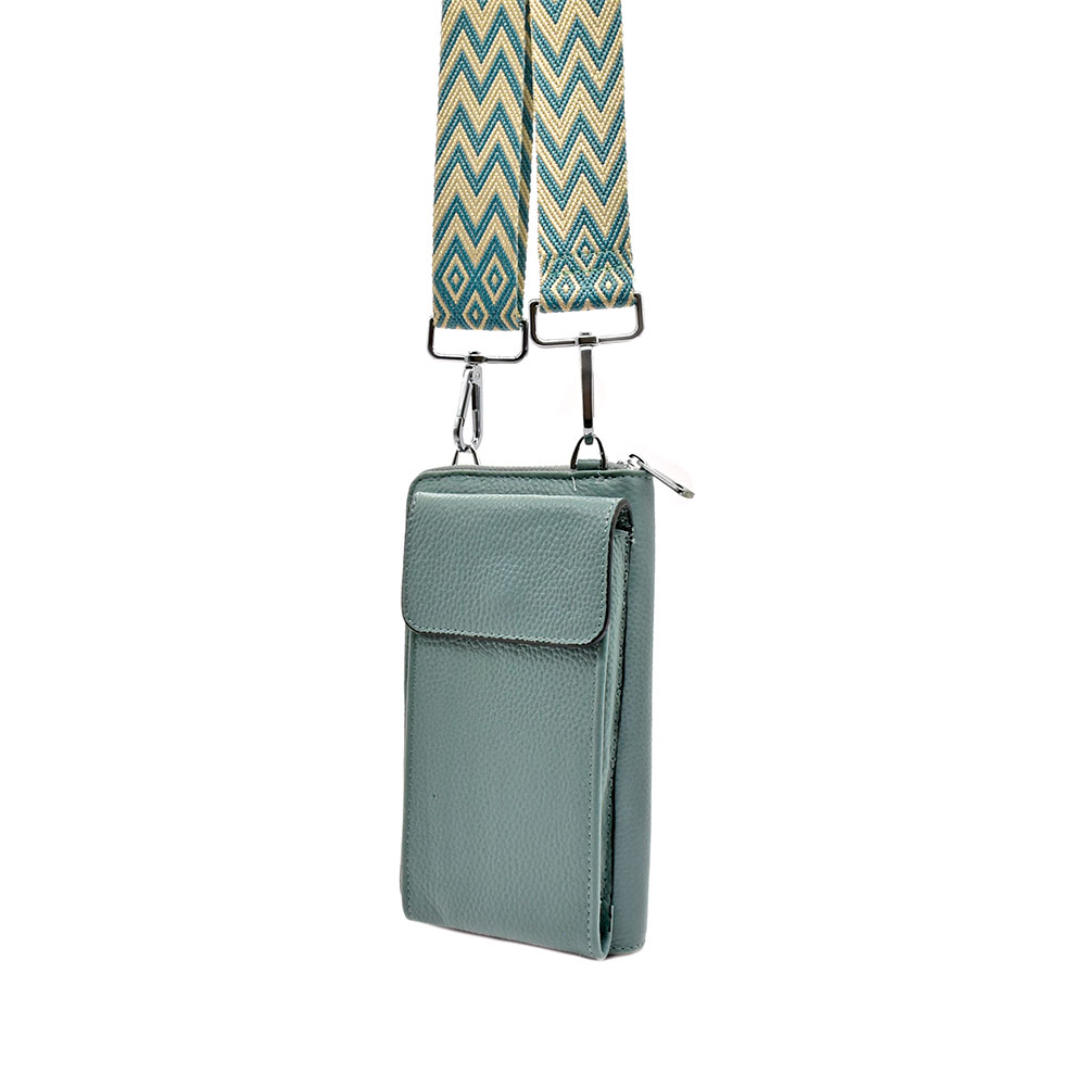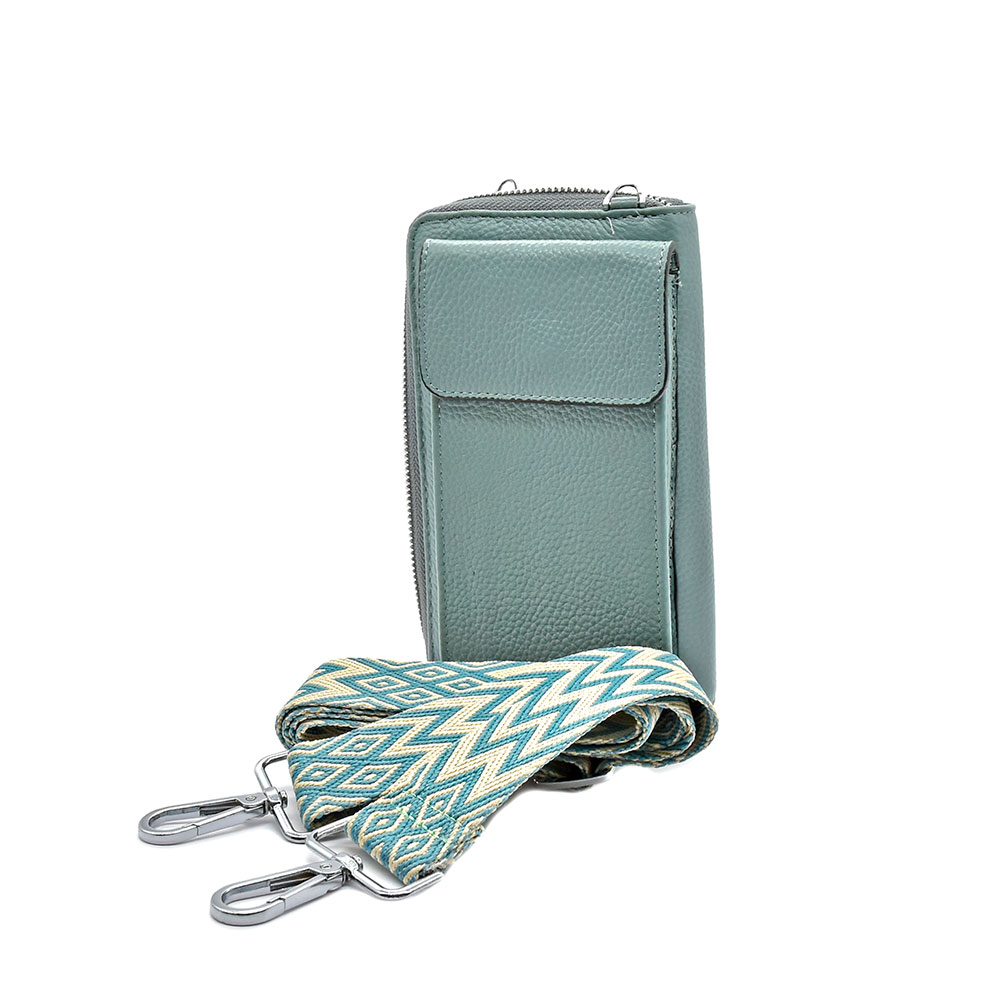 - Bareta reglabila – o combinatie textila de culori azurii si crem, ideala pentru a purta portofelul pe umar sau in jurul gatului.