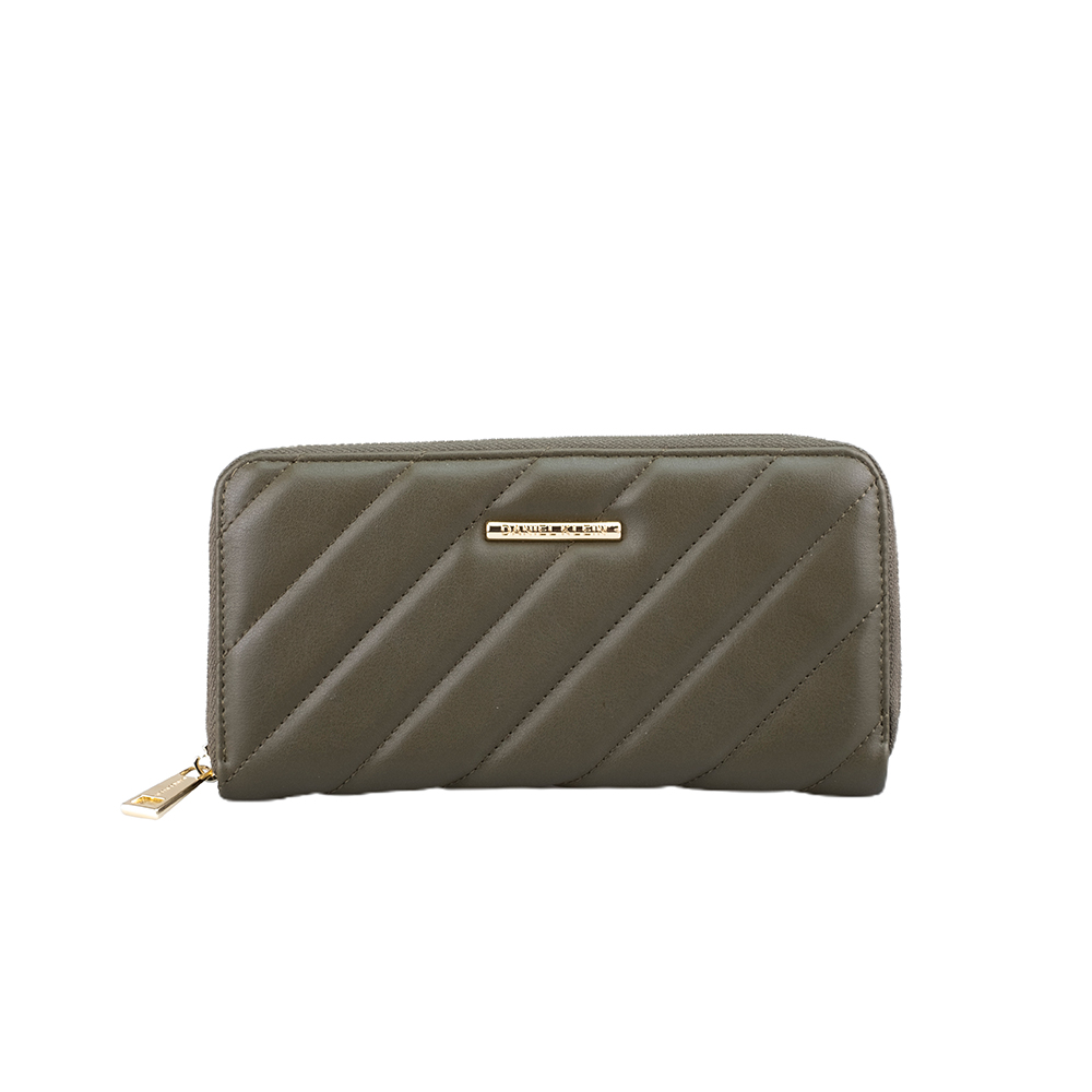 Cu un design modern in nuanta kaki si accesorii aurii, acest portofel adauga o nota de stil oricarei tinute. Sistemul de inchidere cu fermoar asigura siguranta obiectelor personale, iar compartimentarea inteligenta permite organizarea eficienta a banilor, cardurilor si documentelor esentiale.