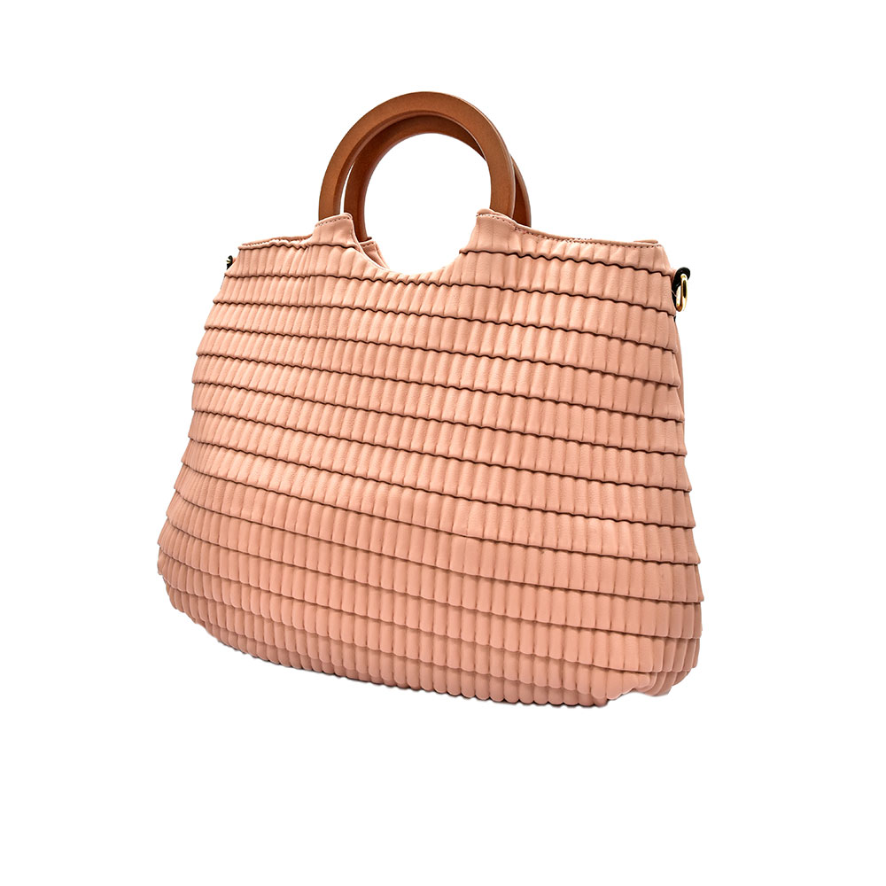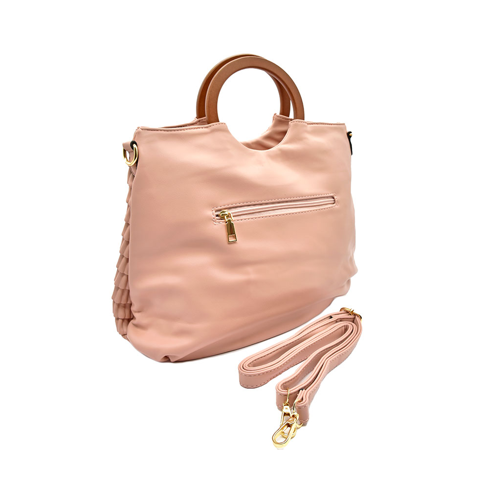 Fabricata din piele ecologica de inalta calitate, aceasta geanta impresioneaza prin textura sa rafinata si manerul unic din lemn, care adauga un aer natural si stilat. Culoarea sa roz delicat o face usor de asortat cu diverse tinute, fie ca alegi un look casual sau unul office.