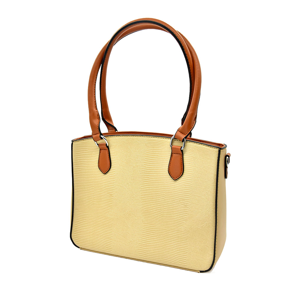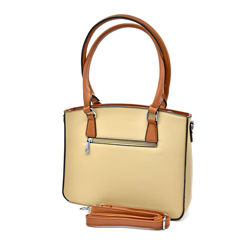 Poseta este dotata cu bareta reglabila maro, permitand purtarea atat pe umar, cat si crossbody, oferind flexibilitate in utilizare. Cele doua manere robuste permit si purtarea in mana sau pe umar, in functie de preferinte.