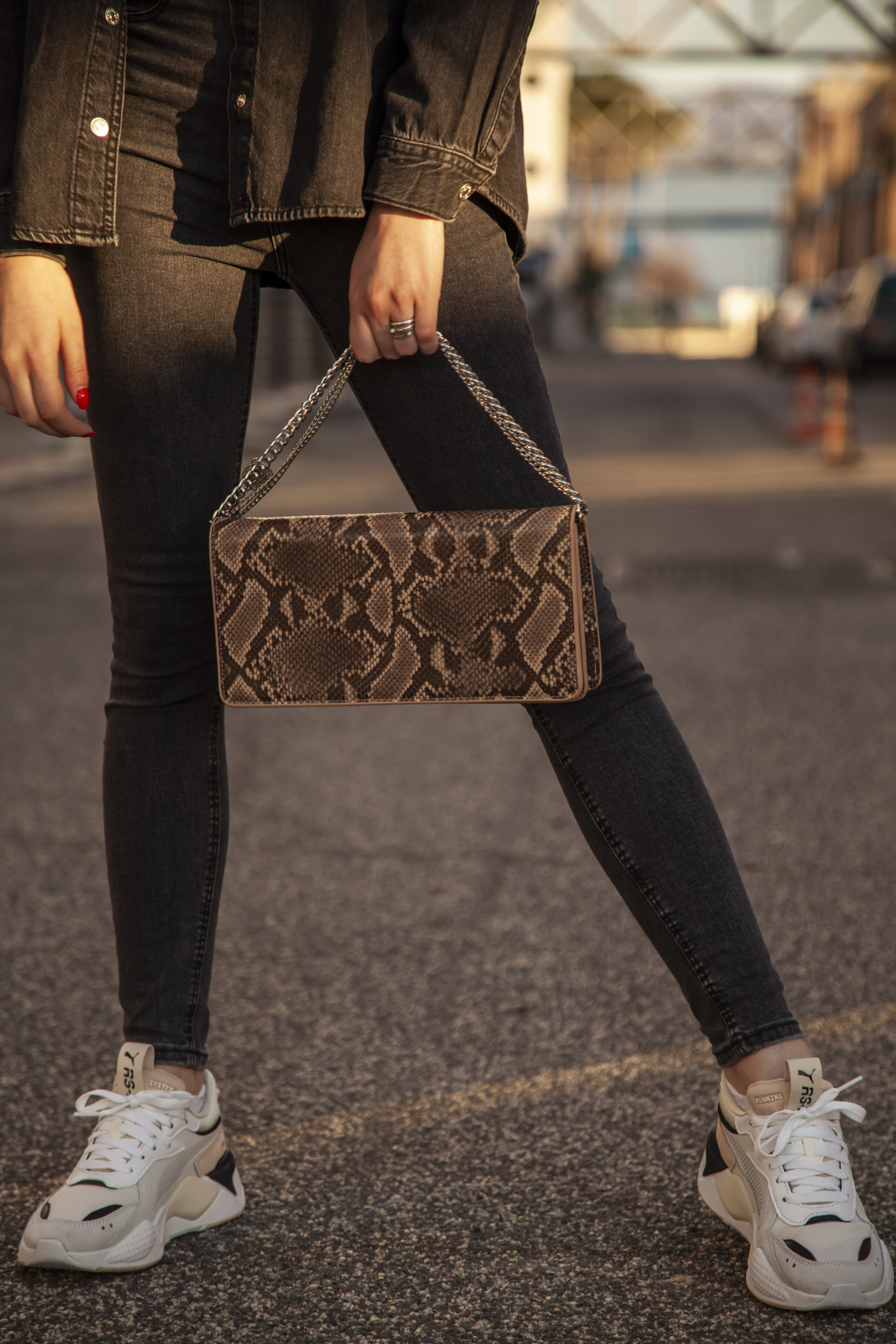 Fabricata din piele ecologica de inalta calitate, poseta se remarca prin imprimeul snake print, un detaliu sofisticat ce adauga un aer luxos oricarei tinute. Accesoriile metalice in nuanta argintie completeaza perfect estetica moderna a gentii.
